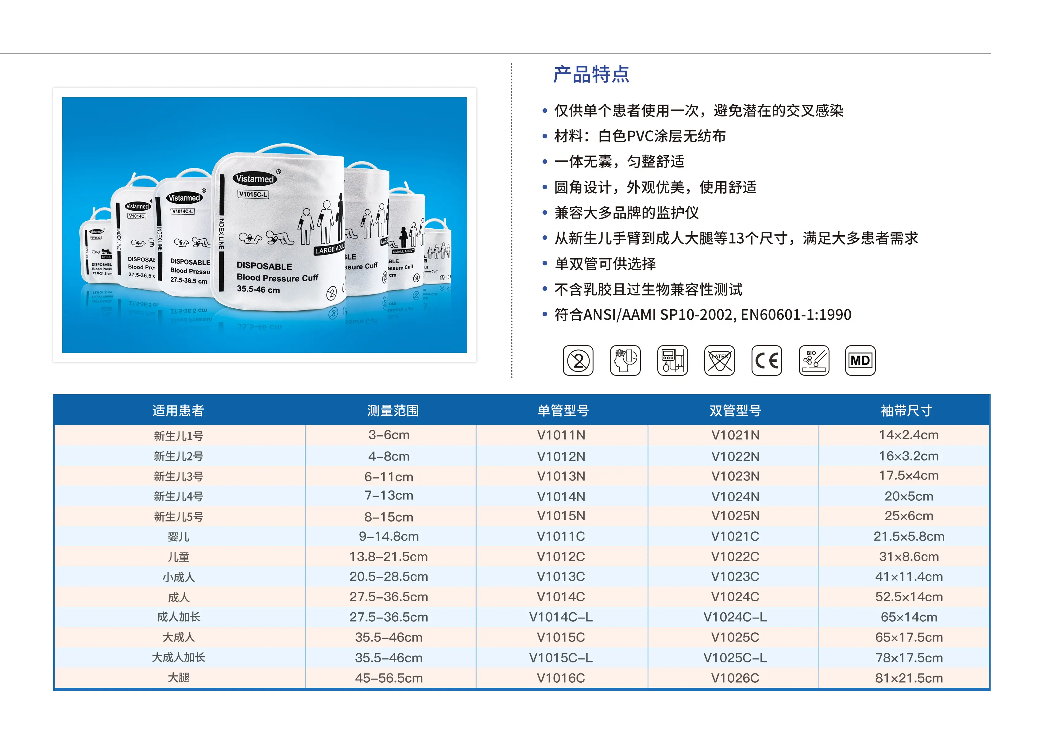 高品质白色无纺布料,过生物兼容测试,舒适柔软,有一定透气性,100%外观、气密性全检。一体式无囊设计,仅供单个患者使用,可有效地避免交叉感染。兼容各大品牌监护仪。