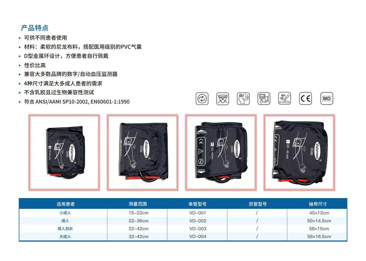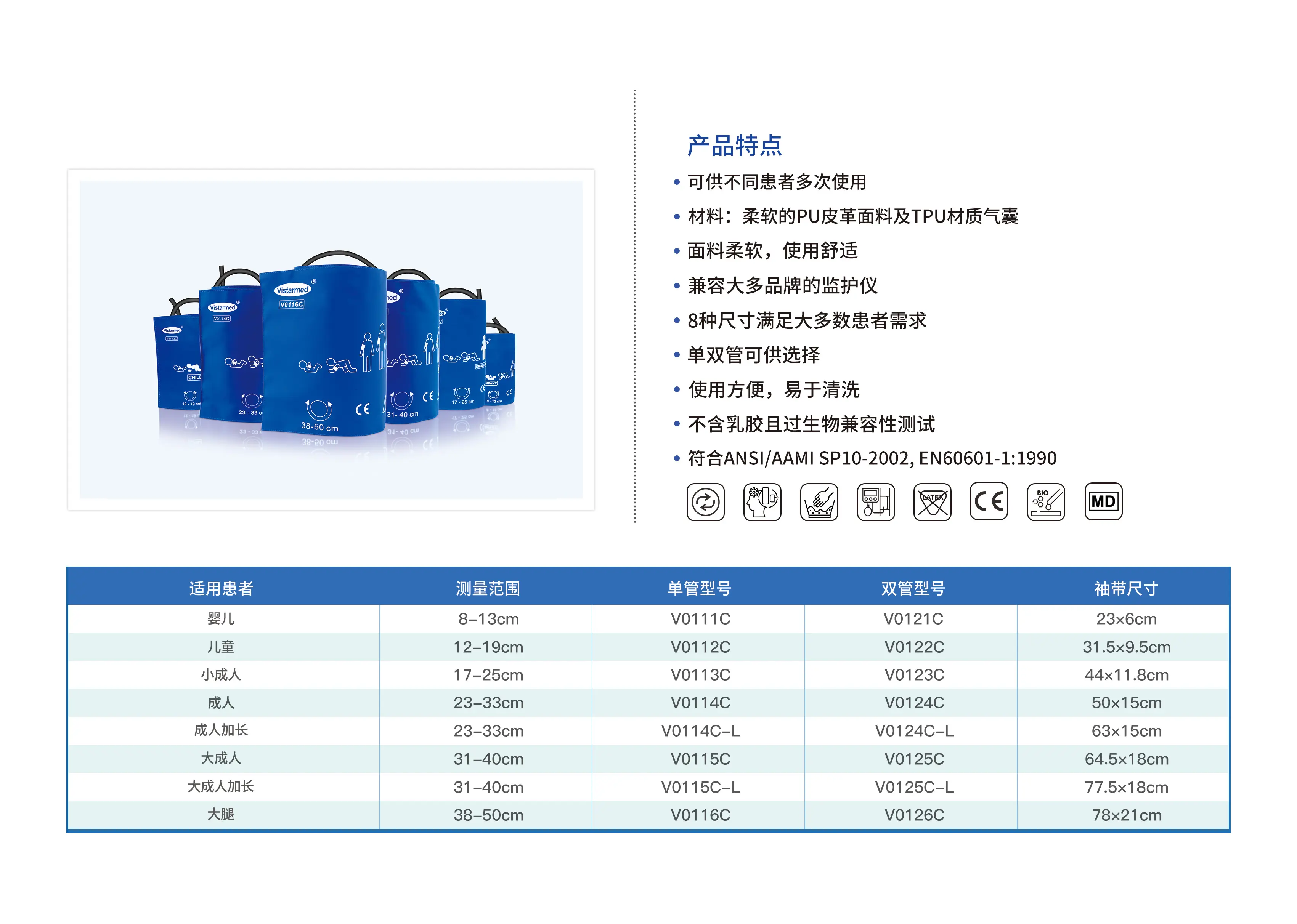 高品质尼龙布料,过生物兼容测试,舒适柔软,有一定透气性,适合患者长时间佩戴,医用级PVC手插管,100%外观、气密性全检,与多参数监护仪,电子血压计等检测设备配套使用。