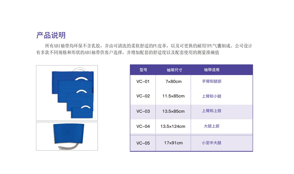 高品质PU皮面料,过生物兼容测试,舒适柔软,有一定透气性,适合患者长时间佩戴,医用级PVC手插管,直段和曲面全系列5个尺寸,满足手臂和大腿不同部位的尺寸需求。支持定制一次性踝臂指数袖带。