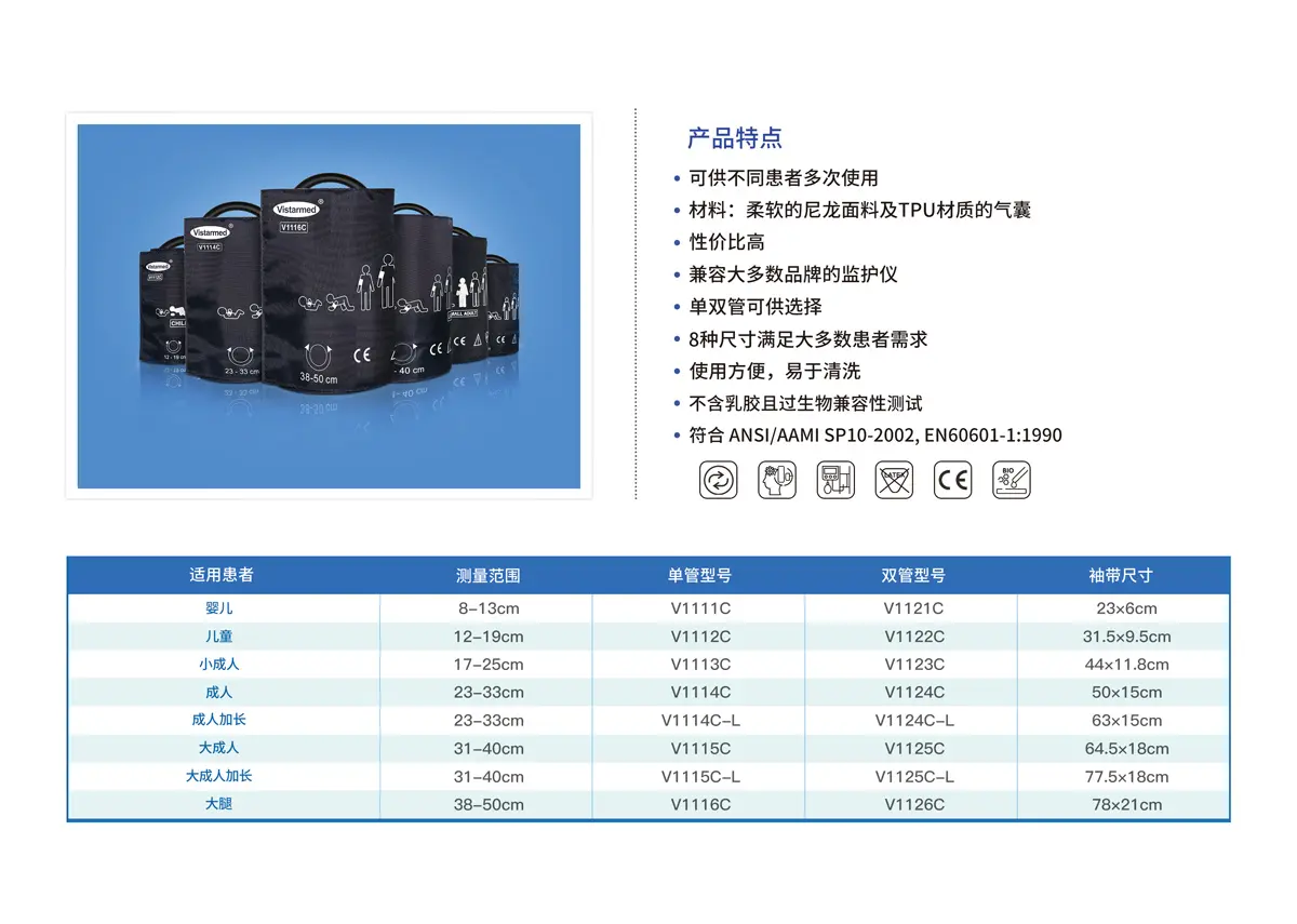 高品质尼龙布料,过生物兼容测试,舒适柔软,有一定透气性,适合患者长时间佩戴,医用级PVC手插管,100%外观、气密性全检,兼容各大品牌电子血压计等检测设备,支持OEM&ODM定制。