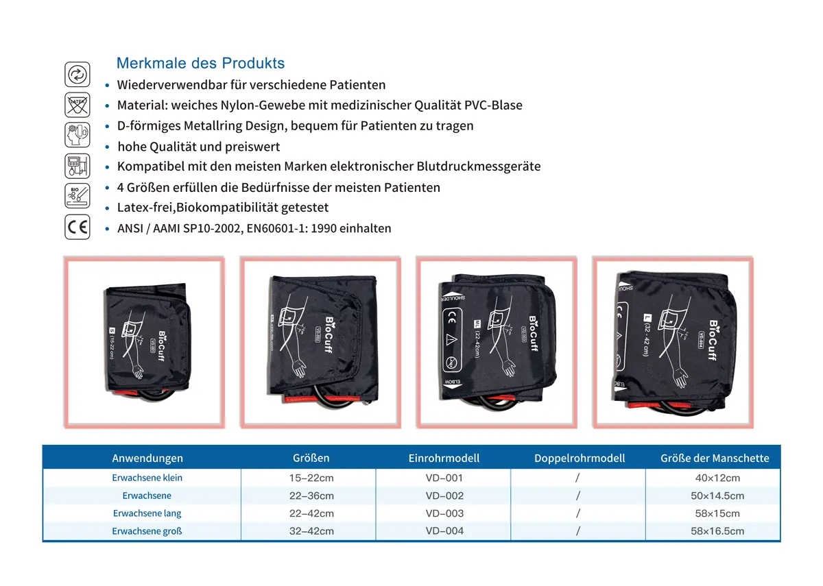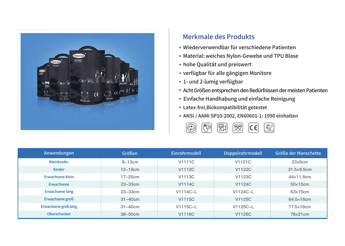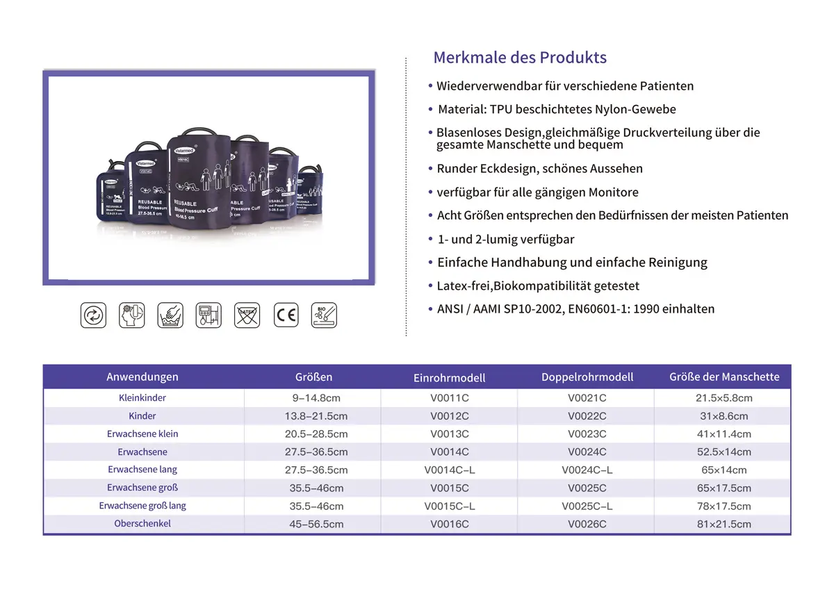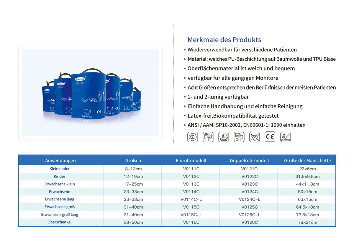 Hochwertiger biokompatibles Nylon Obematerial,bequem und weich,wischdesinfizierbar;Latex-frei,100% Aussehen und Dichtheitsprüfung;Mit medizinischem PVC-Luftschlauch und TPU-Blase;Die V00-Serie ist verfügbar für alle gängigen Monitore und Blutdruckmessgeräte.