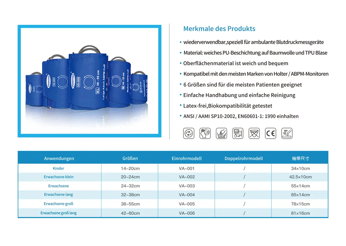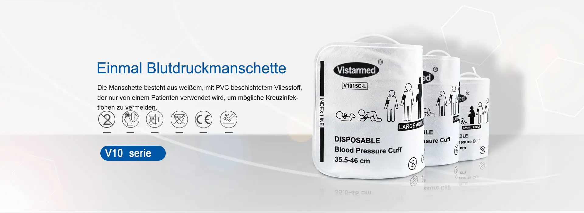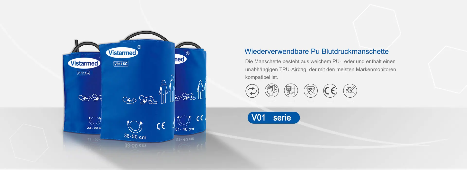 Hochwertiger biokompatibles Nylon Obematerial,bequem und weich,wischdesinfizierbar;Latex-frei,100% Aussehen und Dichtheitsprüfung;Mit medizinischem PVC-Luftschlauch und TPU-Blase;Die V00-Serie ist verfügbar für alle gängigen Monitore und Blutdruckmessgeräte.
