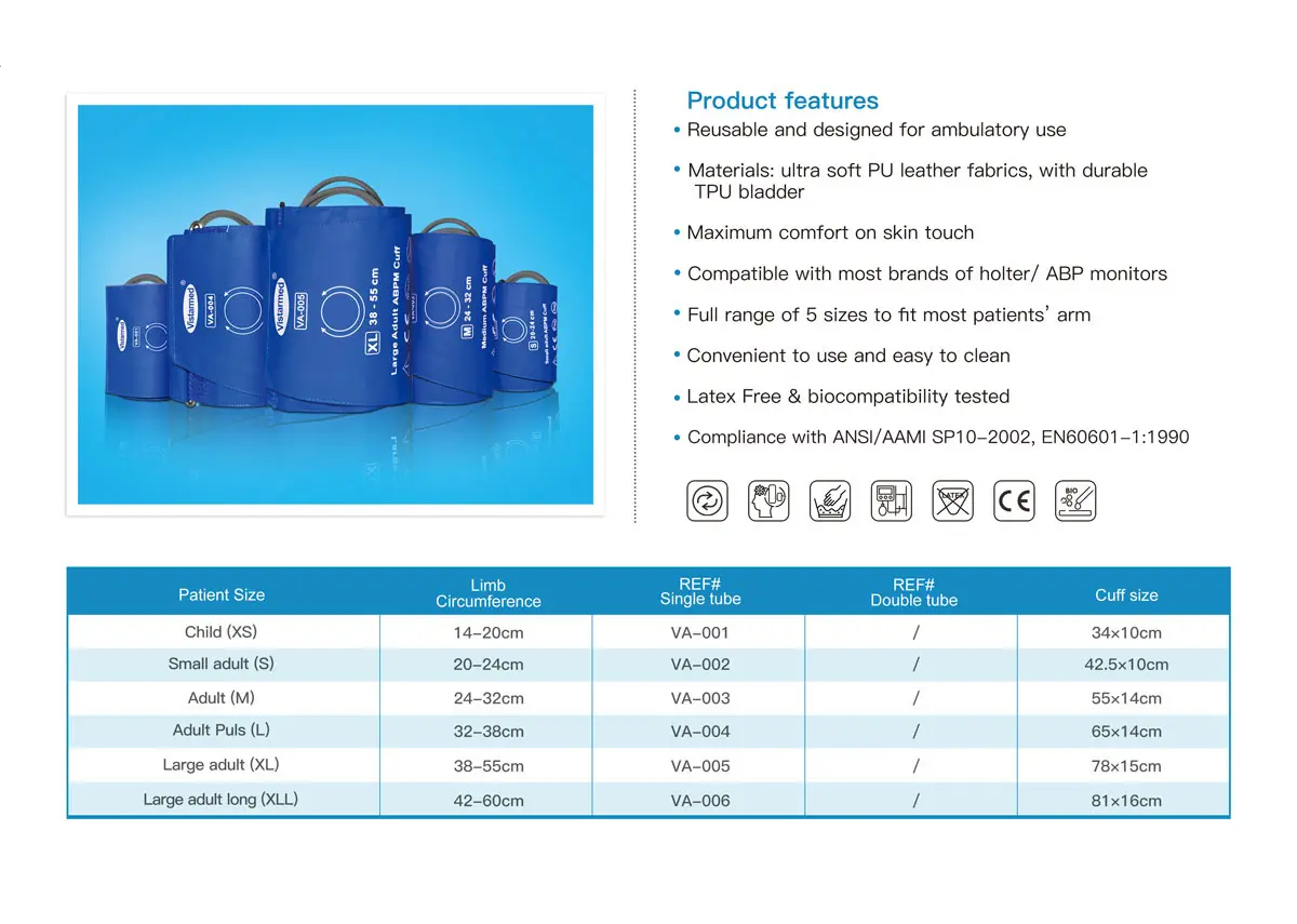 High quality PU Leather material has passed the biocompatibility test,soft and comfortable to wear,suit for long time use.With medical grade silicone air hose,100% appearance and leakage test.VA series is especially used with 24-hour ambulatory blood pressure monitor,OEM &ODM services can be offered.